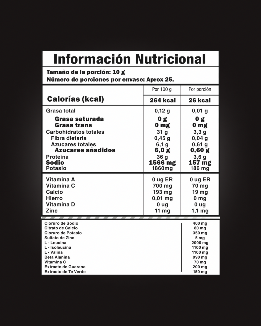 INGREDIENTES: Fruta deshidratada en polvo, Leucina, Isoleucina, Valina, sabor artificial (al sabor que corresponda), Beta-alanina, Ácido cítrico, Cloruro de sodio, Extracto de guaraná (100mg/100ml), Extracto de té verde (125mg/100ml), Ácido málico, Citrato de calcio, Cloruro de potasio, edulcorante artificial (sucralosa), Ácido ascórbico, colorante artificial, Sulfato de Zinc.